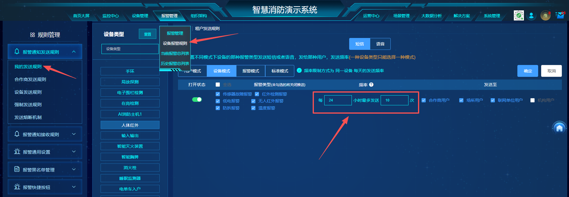 电脑端常见问题通知管理类如何限制一台设备的发送通知次数本页总览如何限制一台设备的发送通知次数可以设置设备的报警发送规则,当报警的次数超出配置的发送规则时,则当设备报警时就不会发送报警通知设置设备报警发送频率操作步骤:点击设备报警规则点击我的发送规则选择所需配置的设备类型点击配置设置设备报警发送频率