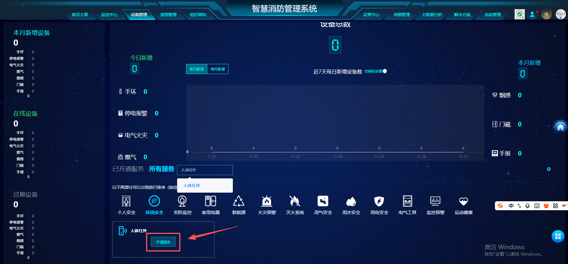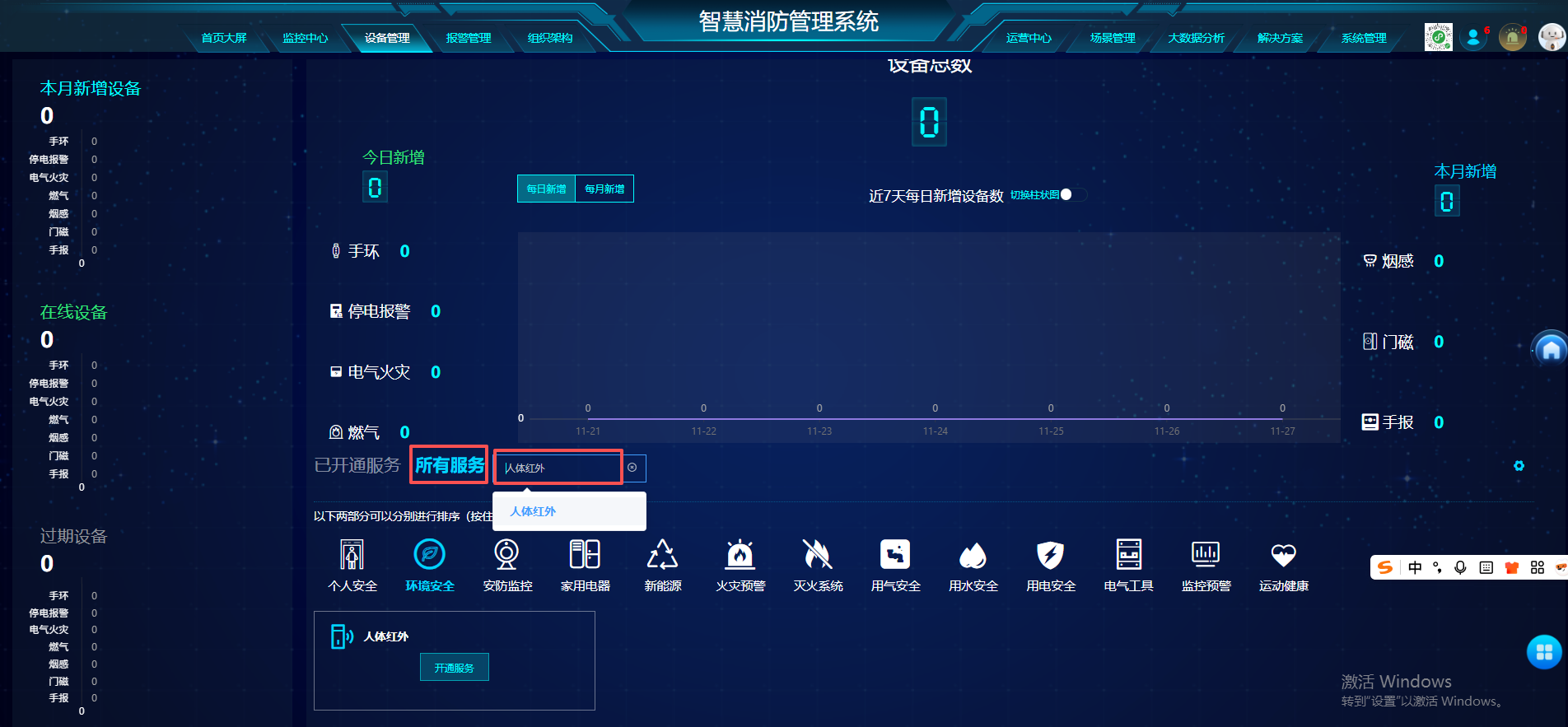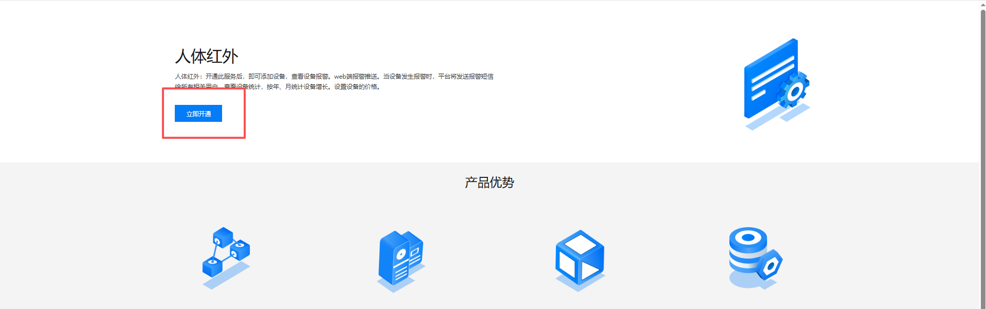 电脑端操作手册设备管理租户开通服务本页总览租户开通服务新入驻的租户是没有开通如何设备服务的,因此要想添加设备需要先开通设备服务。开通服务无需花费费用。如何开通服务?以人体红外为例第一步:点击设备管理第二步:点击所有服务,输入人体红外查找第三步:点击开通服务第四步:点击立即开通第五步:点击立即购买第六步:确定开通,重新登录即可